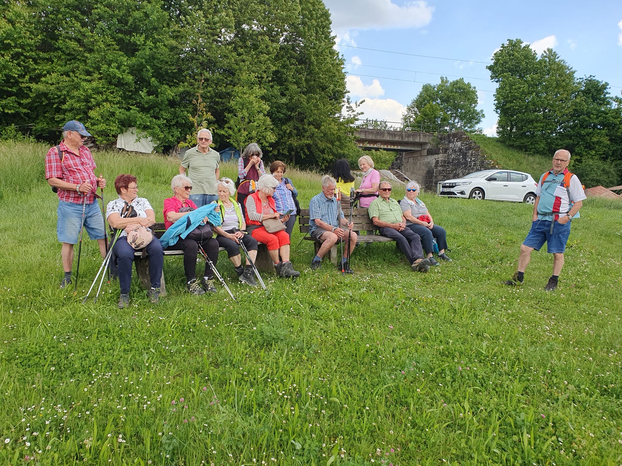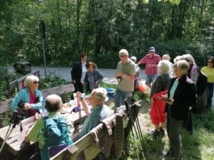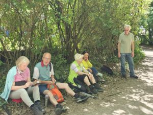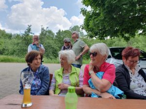 Am 18. Mai 2025 trafen sich 14 Bergsportler und eine Gastwanderin am Plattenwaldparkplatz in Backnang zur nächsten Wanderung. Unsere beiden Backnanger Kameradinnen hatten für die Gruppe als Auftakt einen kleinen Imbiss aufbereitet. Frisch gestärkt wanderte die Gruppe anschließend auf einem Naturlehrpfad hinunter bis zum Ufer der Murr. Auf urigen Fußpfaden direkt an der Murr entlang durch schöne Auenwälder führte der Weg bis zum Vereinsheim des Zeller Schützenvereins. Wir hatten mit dem Wetter Glück, denn diese Pfade können nur bei trockenem Wetter gefahrlos begangen werden. Nach kurzem Aufenthalt bei den Schützen ging es auf befestigten Wegen weiter über die Murrbrücke in den Ortskern von Zell und von dort bergauf über einen Höhenweg zum Kelterberg. Hier gab es immer wieder schöne Aussichten, teils bis zum Fernsehturm nach Degerloch. Nach ausgiebiger Vesperpause führte der Weg an Wochenendhäusern vorbei und über eine Forststraße bergab zurück nach Zell. Über den Zeller Kirchweg wanderte die Gruppe wieder hoch zum Plattenwald. Man kam zu einem großräumig eingezäunten Wildgehege, in dem sich unter anderem ein Rudel Damwild tummelt. Weiter führte der Weg dann vorbei am schönen Waldfriedhof bis zum Waldheim, wo im lauschigen Biergarten der Abschluss stattfand.